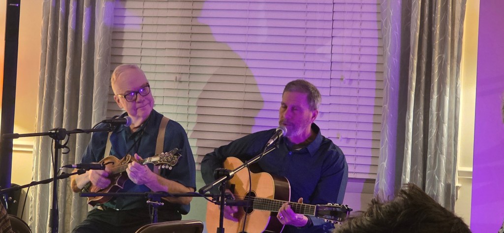 The more than 20 people attending enjoyed the music, the story, the interplay between Michael and Tom. Tom’s mandolin playing, brought a beautiful addition to the timbre of the music. Wow.